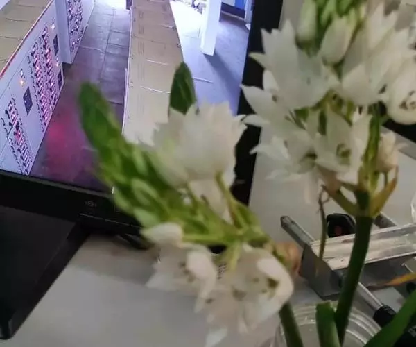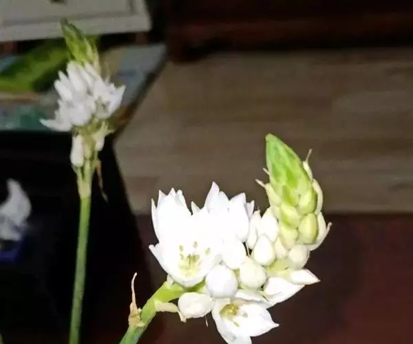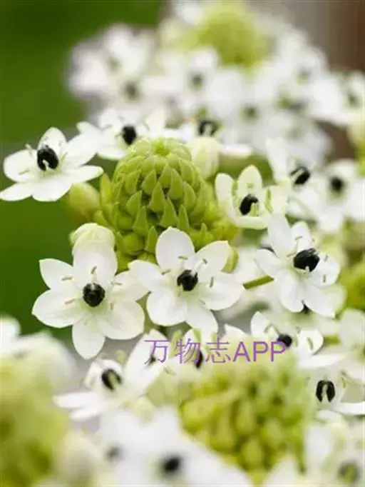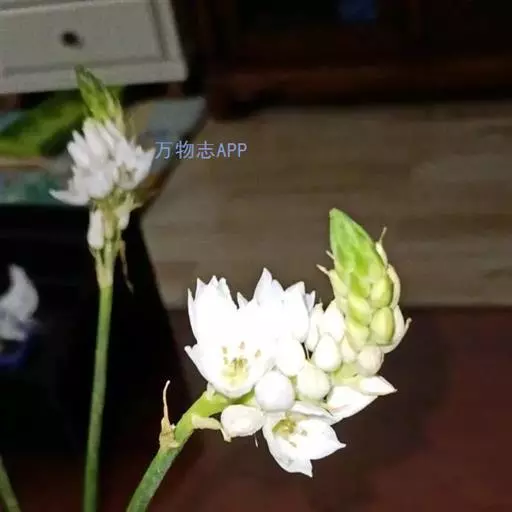 球根植物,叶7-8,无毛,末端渐细,长60cm。花25朵簇生于长茎,茎圆柱形。下部生长的花有长柄,所有的柄都有苞叶包裹,苞叶先端尖,绿色,略带白色,花宽为50mm ,被片6,纯白色,子房位于中间,紫黑色,形成鲜明的对比。蒴果,圆柱形。