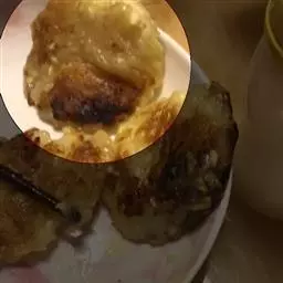 3.取一个剂子,两端封口,擀成薄片儿,放入六成热的油锅中,两面煎黄,待饼鼓起来就熟了