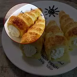 4.炸好的薄饼放在案板上一切四,这样做出来的薄饼,外皮儿酥脆,里外分层,最适合趁热吃!