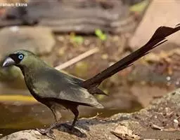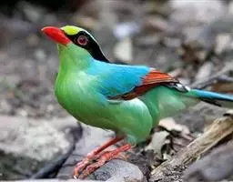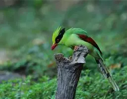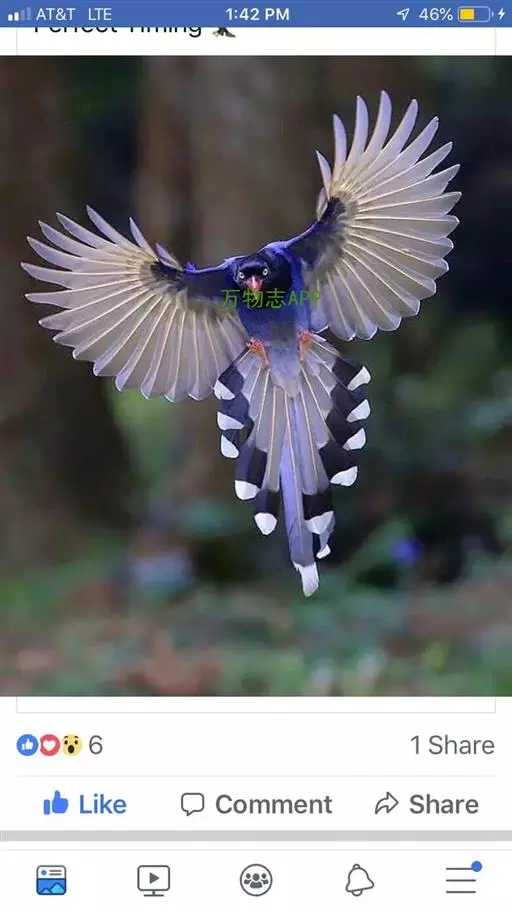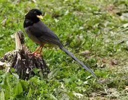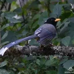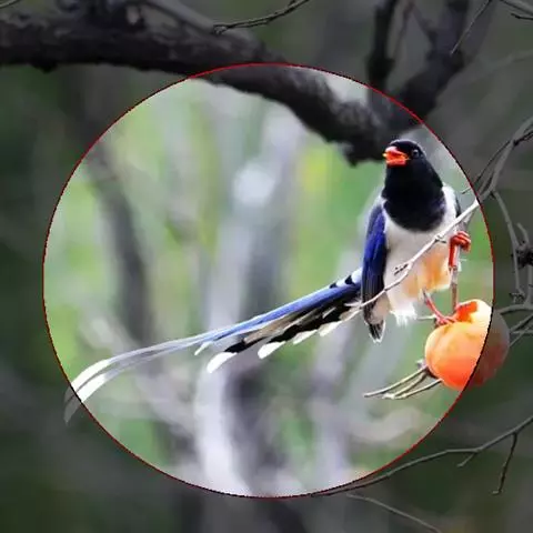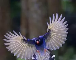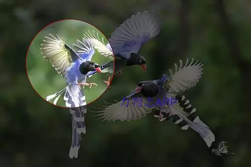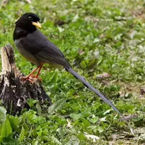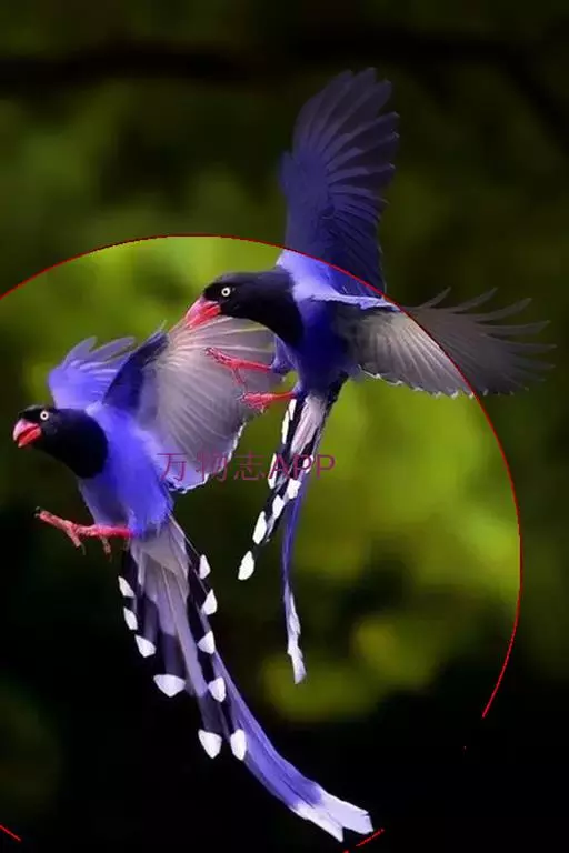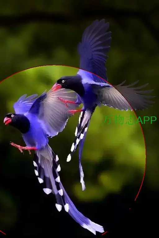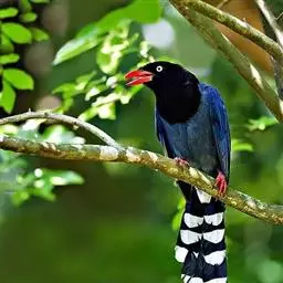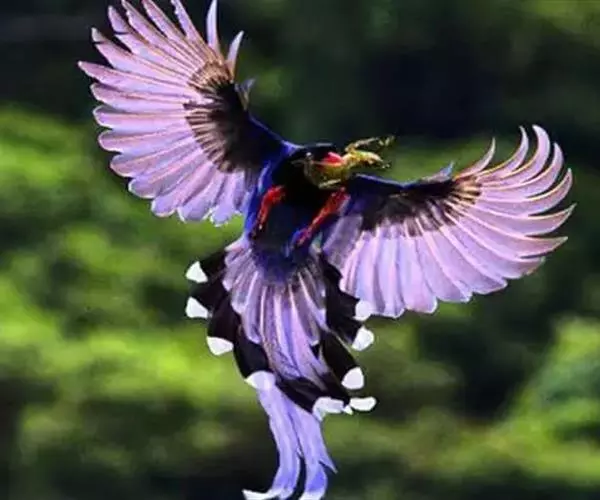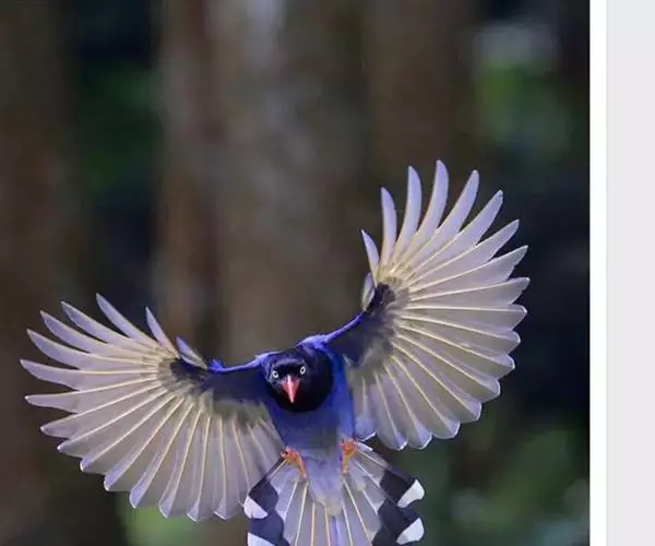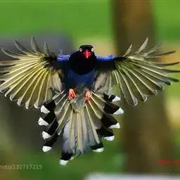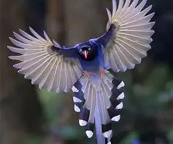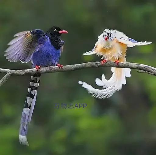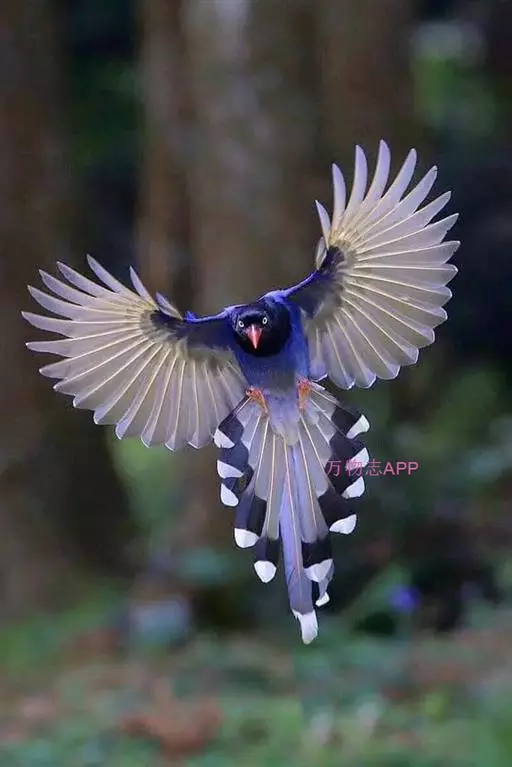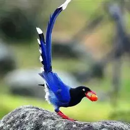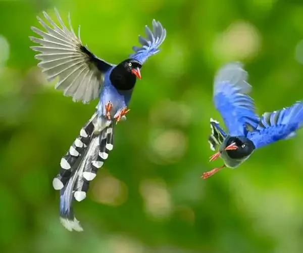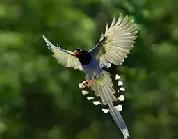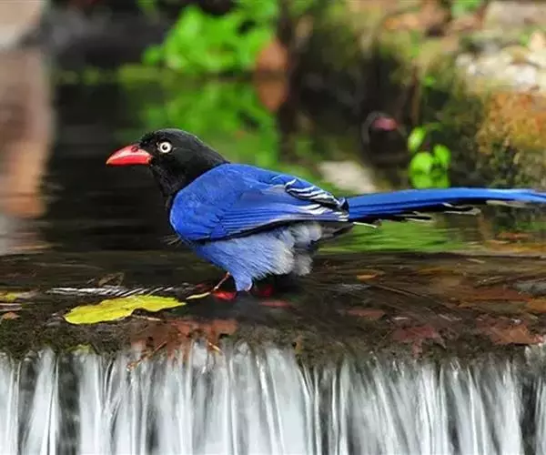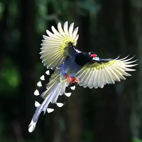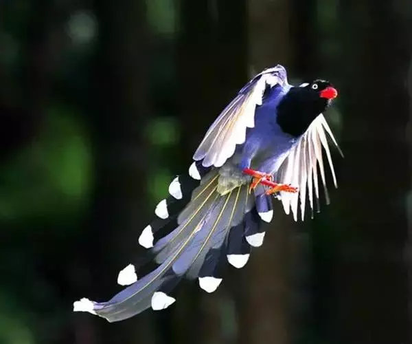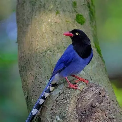 台湾蓝鹊(学名:Urocissa caerulea):体长64至65厘米,翼展18至21厘米,尾长约40厘米,尾羽长占了总体长的三分之二。头、脸、颈、喉、胸都是黑色,黄色的眼珠包围黑色的瞳孔,鲜红色的鸟喙、双脚,身体上半部可目视处及下半部的腹部呈鲜蓝色,有十二根尾羽,最长二羽为蓝根白尾,其于为黑根白尾,左右对称。下腹和尾下覆羽灰白色。
