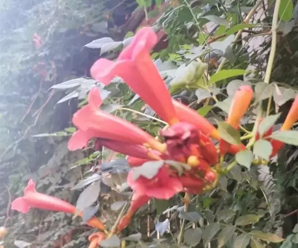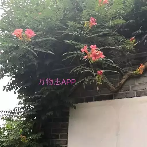 凌霄(学名Campsis grandiflora (Thunb.) Schum.),别名紫葳、五爪龙、红花倒水莲、倒挂金钟、上树龙、上树蜈蚣、白狗肠、吊墙花、堕胎花、芰华、藤罗花。落叶攀援藤本,茎木质,表皮脱落,枯褐色,以气生根攀附于它物之上。叶对生,为奇数羽状复叶顶生疏散的短圆锥花序。花萼钟状,花冠内面鲜红色,外面橙黄色。雄蕊着生于花冠筒近基部,花丝线形,细长。花药黄色,个字形着生。花柱线形,柱头扁平。蒴果顶端钝。花期5-8月。