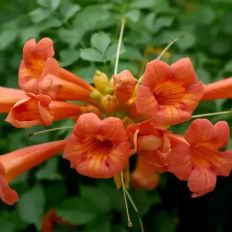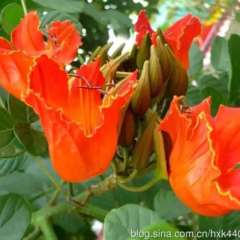 顶生疏散的短圆锥花序,花序轴长15-20厘米。花萼钟状,长3厘米,分裂至中部,裂片披针形,长约1.5厘米。花冠内面鲜红色,外面橙黄色,长约5厘米,裂片半圆形。雄蕊着生于花冠筒近基部,花丝线形,细长,长2-2.5厘米,花药黄色,个字形着生。花柱线形,长约3厘米,柱头扁平,2裂。蒴果顶端钝。花期5-8月。