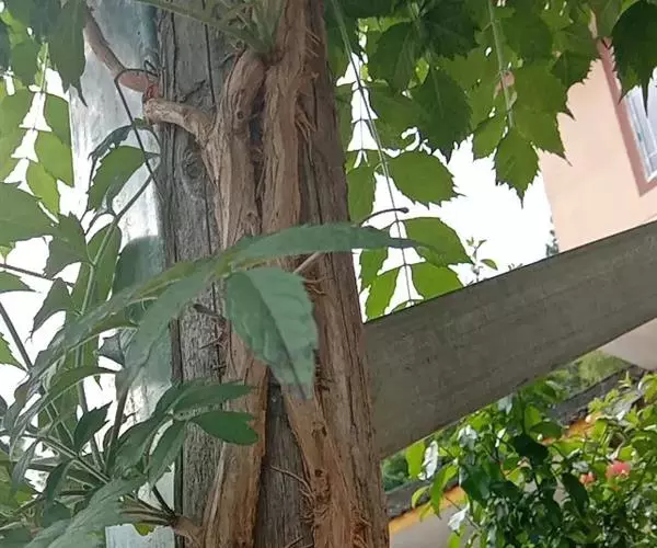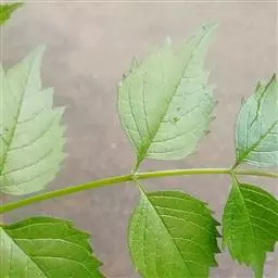 攀援藤本;茎木质,表皮脱落,枯褐色,以气生根攀附于它物之上。叶对生,为奇数羽状复叶;小叶7-9枚,卵形至卵状披针形,顶端尾状渐尖,基部阔楔形,两侧不等大,长3-6(-9)厘米,宽1.5-3(-5)厘米,侧脉6-7对,两面无毛,边缘有粗锯齿;叶轴长4-13厘米;小叶柄长5(-10)毫米。