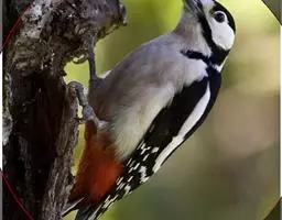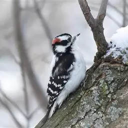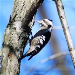 绒啄木鸟,北美洲最小的啄木鸟,白腹黑背和黑项,黑翼上有白色斑点。头部有黑白相间的条纹,尾巴短小,雄…