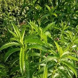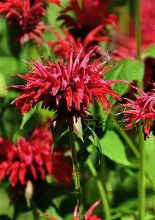 美国薄荷(学名:Monarda didymaL.):也叫马薄荷,属多年生草本植物,株高100-120厘米,茎直立,四棱形,叶质薄,对生,卵形或卵状披针形,背面有柔毛,缘有锯齿。花朵密集于茎顶,萼细长,花冠长5厘米,花簇生於茎顶,花冠管状,淡紫红色,叶芳香。轮伞花序密集多花,花筒上部稍膨大,裂片略成二唇形。花期6-9月。