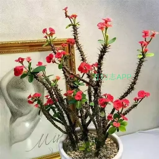 虎刺梅大概是最小巧的花朵,不像杜鹃花那样灿烂似锦,也不如水仙那样纯洁高雅,更比不上牡丹的艳丽富贵,却也活得像模像样,枝头上依然开着小花蕾粉嫩可爱,入花木凋零的冬季,只有虎刺梅凌寒不败,几朵鲜红的小花绽放其间,愈显得风姿绰约,倒给居室增添了不少春意。铁灰色的虬枝,坚硬劲枝若斧削成,尖硬的针刺布满了枝干,骨力昂然地挺出一个凛然不可侵犯的季节意象:枇杷样的叶子嫩而绿,修而长,如今已是绿油油、满盈盈的一盆,将人自然引入琶音黯然、美人何在的深入怀想;枝头蝴蝶似的小红花,每两瓣为一小朵,再组成不大的一簇,夏绿冬红的似着痴守不弃的爱之誓言。
