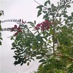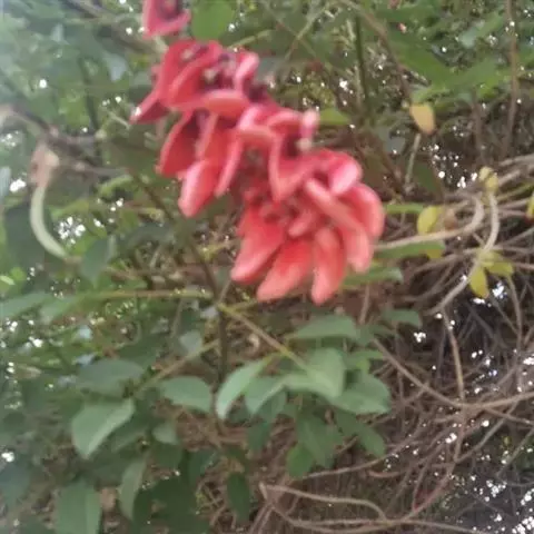 总状花序顶生,长10-16厘米,上有密集、成对着生的花;总花梗木质,粗壮,长7-10厘米,花梗长约1厘米,具短绒毛;花萼佛焰苞状,长2-3厘米,口部偏斜,一边开裂;花冠红色,长6-7毫米,旗瓣椭圆形,长5-6厘米,宽约2.5厘米,先端圆,瓣柄短;翼瓣与龙骨瓣近等长;龙骨瓣2片离生,雄蕊10,单体;子房被微柔毛;花柱无毛。