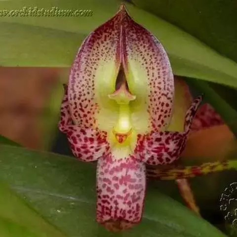 斑唇贝母兰,根状茎稍粗壮,假鳞茎在根状茎上较密集,叶长圆状倒披针形,革质,花葶连同幼嫩的假鳞茎和叶从靠近老假鳞茎基部的根状茎上发出,长12—14厘米,初时大部分为鞘所包,仅伸出花序,总状花序长4––6厘米,通常具2朵花,花色泽不详,直径达4厘米,花期6月,产云南南部(思茅、普文)。生于岩石上,海拔1300米。越南、老挝、缅甸、泰国 ·也有分布。