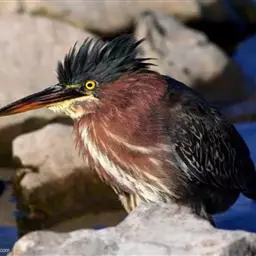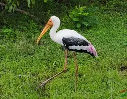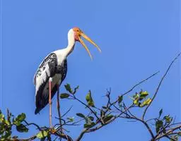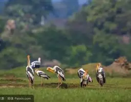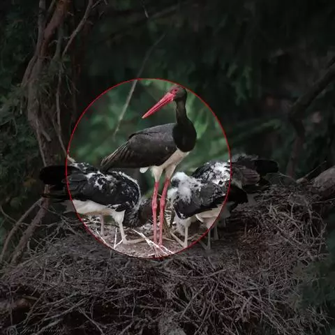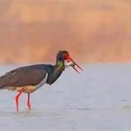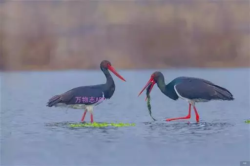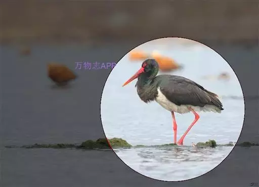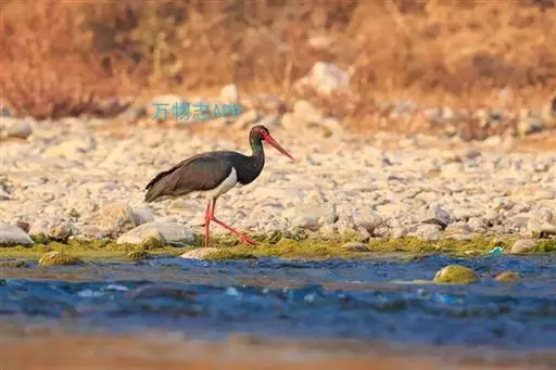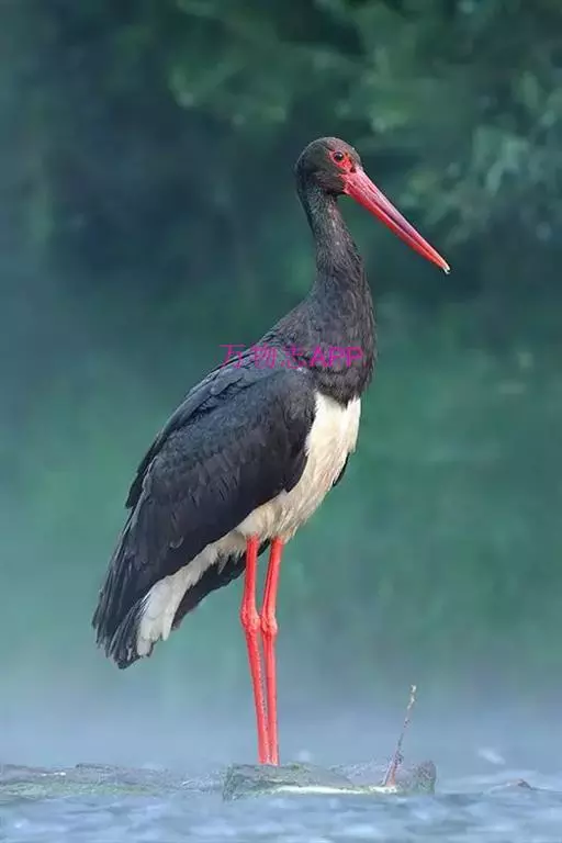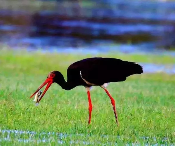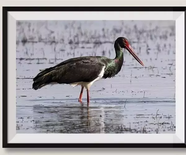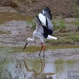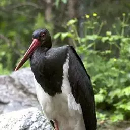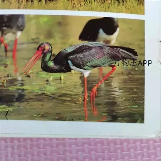 黑鹳,又叫“乌鹳”、“锅鹳”。它体长约1米,上体羽毛为黑色,并带有紫绿色的金属光泽,胸下部及腹部羽毛为白色,嘴、腿均为红色。黑鹳在我国分布较广,种群数量要比白鹳多。夏季在北方各省都可见到黑鹳,冬天它们则去南方越冬。黑鹳喜欢结群,常常在沼泽和湿地间觅食,以鱼、蛙、甲壳动物等为主要食物,年产卵2-6个,呈白色。在东北、华北一带的黑鹳,常筑巢于山区的岩隙悬崖间,而新疆的黑鹳则在塔里木河流域的胡杨树上营巢。