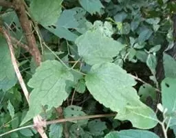 三出复叶;小叶片亚革质或厚纸质,卵圆形,宽卵圆形至近于圆形,长6-10厘米,宽3-9厘米,顶端短尖基部圆形或楔形,有时偏斜,边缘有不整齐的粗锯齿,齿尖有短尖头,上面暗绿色,近于无毛,下面有曲柔毛,尤以叶脉上为多,主脉及侧脉在上面平坦,在下面显著隆起;叶柄粗壮,长达15厘米,被毛;顶生小叶柄长,侧生者短。