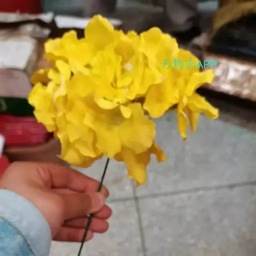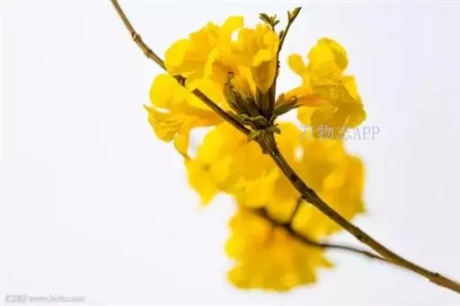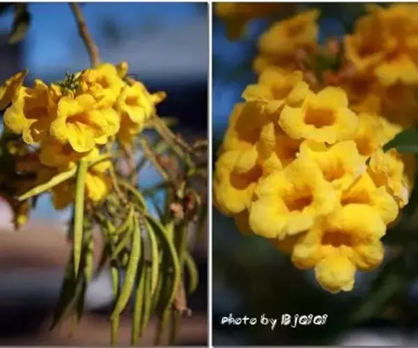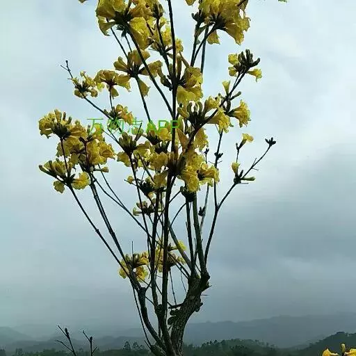 黄钟木别名黄花风铃木,树高约5米;掌状复叶,小叶3-5枚,叶片被褐色细茸毛;花集生于枝端,花冠漏斗形,鲜黄色;果实圆柱形,下垂,被褐色茸毛,形如可爱的小猫尾巴。先花后叶,春季绽放风铃般的花朵挂满枝头,花团锦簇,形成一片金黄色的花海,极为壮观,可做行道树、庭院树。