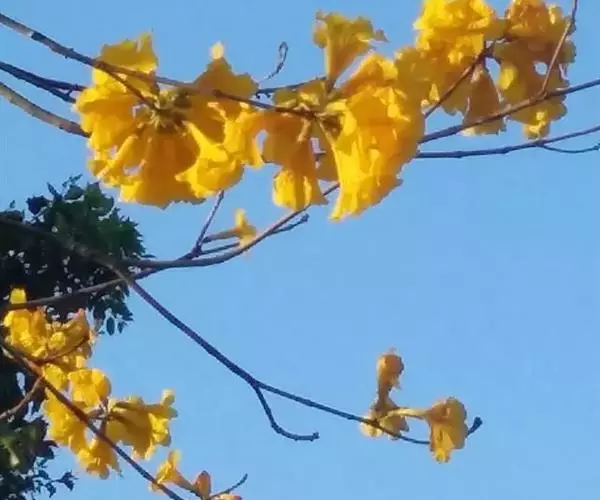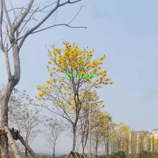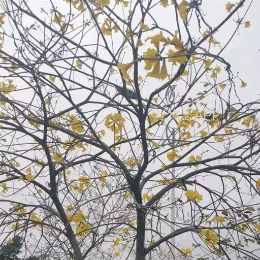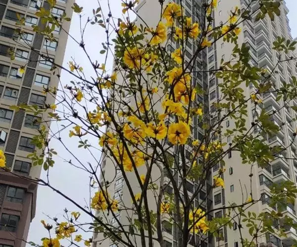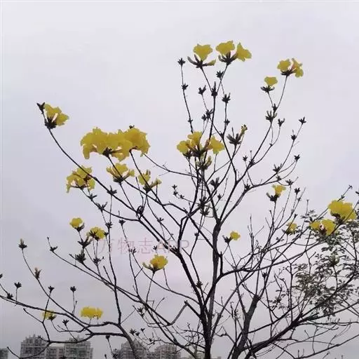 黄钟木【学名:Tabebuia chrysantha (Jacq.) Nichols.】,紫葳科、黄钟木属 落叶小乔木,原产中南美洲。常作为优良的行道树,也可种植在庭院、校园、住宅区等地,花色金黄明艳,适合公园、绿地等路边、水岸边栽培观赏。
