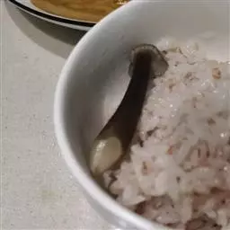 5、小心倒入电饭煲中,用筷子将表面扒平一点