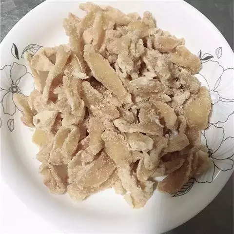 2.菜油烧熟,加入生姜和花椒粒少许,油锅端离火口。10分钟后油锅再置火上,捞去生姜、花椒粒。然后将牛肉片均匀的抹上醪糟汁下油锅炸透,边炸边用漏勺轻轻搅动。待牛肉片炸透,即将锅端离火口,捞出牛肉片。