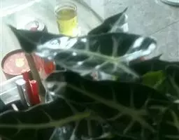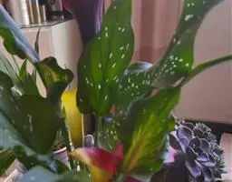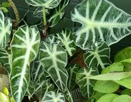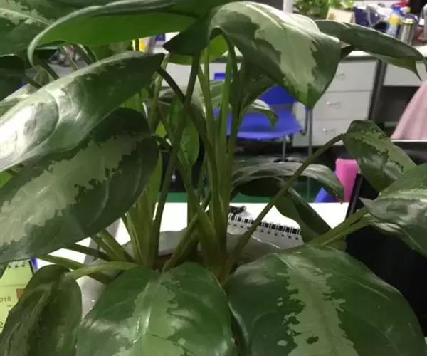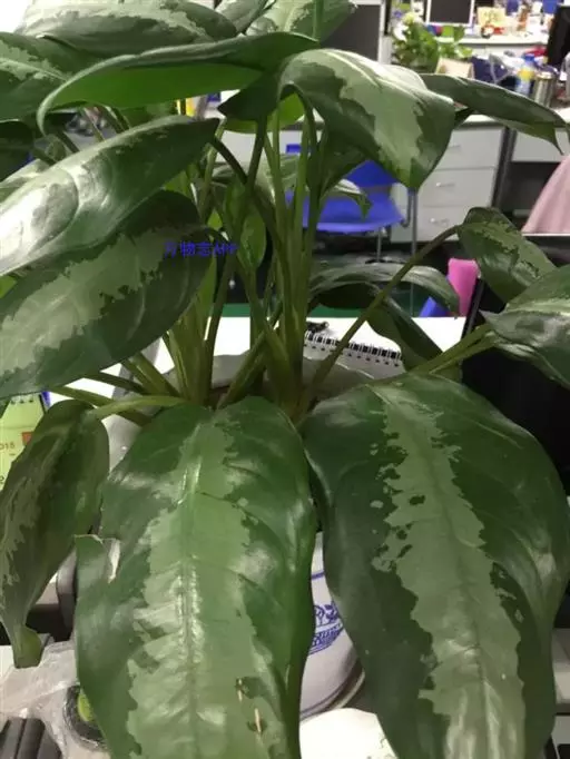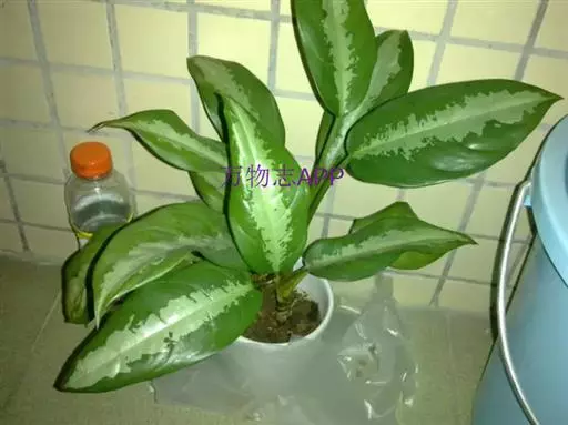 雅丽皇后又名白雪粗肋草、银河粗肋草。植株直立,叶片披针形,革质,锐尖,叶深绿色。中肋两侧具银灰色大块条状斑块,叶缘与中脉处为暗绿色。本种生长势强,易生分枝。耐阴性极强。银河粗肋草:叶阔披针形,沿中肋有银灰色宽条斑。