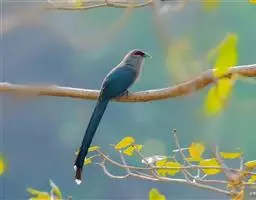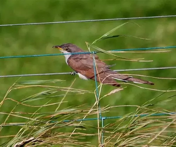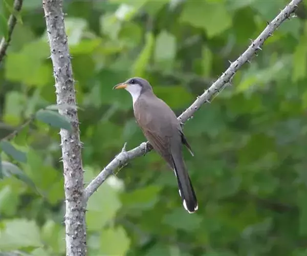 黄嘴杜鹃(Coccyzus americanus):成鸟体长26-30厘米,体重55-56克。有一条长长的尾巴,上面是棕色,下面是黑色和白色相间,下颌至鸟喙有带黄色的一个黑色弧形。主要以昆虫为食,尤其喜吃鳞翅目幼虫,如松毛虫,树粉蝶幼虫、蛾类等,有时也吃植物种子等少量植物性食物。