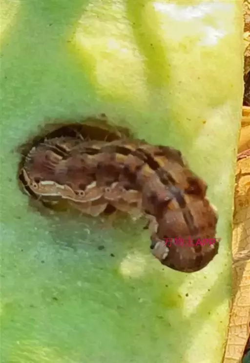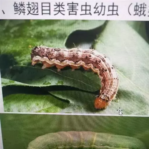 幼虫:老熟幼虫长约40~50mm,初孵幼虫青灰色,以后体色多变,分4个类型:1)体色淡红,背线,亚背线褐色,气门线白色,毛突黑色。2)体色黄白,背线,亚背线淡绿,气门线白色,毛突与体色相同。3)体色淡绿,背线,亚背线不明显,气门线白色,毛突与体色相同。4)体色深绿,背线,亚背线不太明显,气门淡黄色。头部黄色,有褐色网状斑纹。虫体各体节有毛片12个,前胸侧毛组的L1毛和L2毛的连线通过气门,或至少与气门下缘相切(区别于烟夜蛾)。体表密生长而尖的小刺。