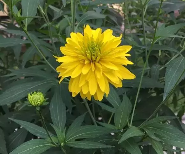 多年生草本,高60~180厘米。茎分枝;上部叶片阔披针形,叶较宽,基生叶羽状5~7裂;茎生叶3~5裂,边缘具稀锯齿。头状花序具长柄,花径10~20厘米,黄色,重瓣,花期6—8月。