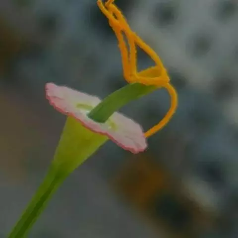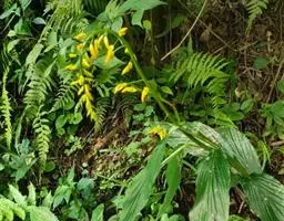 株高30-50厘米。叶片5-6枚,椭圆状披针形,长15-20厘米,宽3-4.5厘米,无毛,顶端尾状渐尖,基部钝;叶柄长约5毫米;叶舌短。圆锥花序长5-11厘米,下垂,上部有分枝,分枝长1-2.5厘米,疏离,有2-多花,下部无分枝,而在苞片内仅有珠芽;苞片披针形,长6-12毫米;珠芽卵形,表面疣状,直径2-4毫米。花黄色,小花梗极短;萼钟状,长4-5毫米,具3齿;花冠管长8-10毫米,被短柔毛,裂片卵形;侧生退化雄蕊披针形,镰状弯曲;唇瓣狭楔形,黄色,顶端2裂,基部具橙红色的斑点;花丝长1厘米,弯曲,花药每边有2个三角形、翅状附属体;子房具疣点。花期:8-9月。