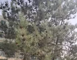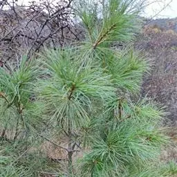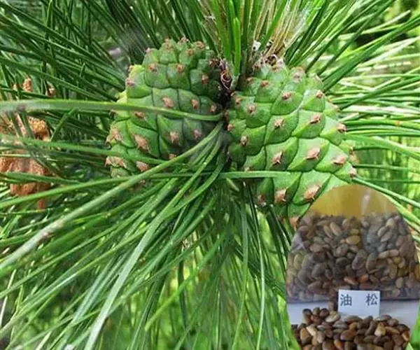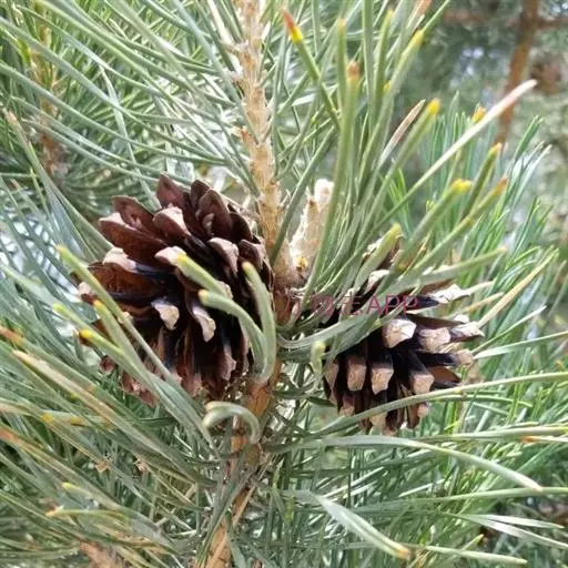 油松(学名:Pinus tabuliformis Carr.) :为松科针叶常绿乔木,高达30米,胸径可达1米。树皮下部灰褐色,裂成不规则鳞块。大枝平展或斜向上,老树平顶;小枝粗壮,雄球花柱形,长1.2-1.8厘米,聚生于新枝下部呈穗状;球果卵形或卵圆形,长4-7厘米。种子长6-8毫米,连翅长1.5-2.0厘米、翅为种子长的2-3倍。花期5月,球果第二年10月上、中旬成熟。