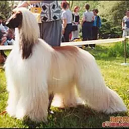 阿富汗猎犬全身披丝绢状的长毛,毛色鲜艳,呈多种颜色,背中线附近毛短,…