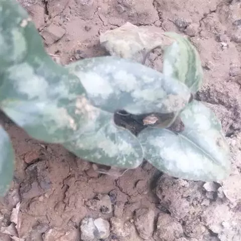 多年生草本;根状茎短,根丛生,稍肉质,直径1-2毫米。叶片阔心形至肾心形,长和宽各为3-8厘米,先端钝或圆,基部心形,两侧裂片长1-3厘米,宽1.5-3.5厘米,叶面深绿色,中脉两旁有白色云斑,脉上及其近边缘有短毛,叶背浅绿色;叶柄长3-15厘米;芽苞叶肾心形或倒卵形,长和宽各约1厘米,边缘有睫毛。