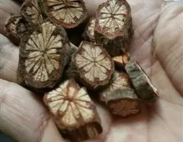 种子横切面尖梯形或不规则三角形,外周微波状。假种皮细胞多列,切向延长。种皮表皮细胞径向延长,长圆形或类长方形,长40-90μm,直径10-45μm,外被角质层。下皮细胞1列,切向延长,含红棕色或黄棕色色素。油细胞1列,褐红色或棕红色,径向延长,圆柱形,长至26μm,直径至21μm,胞腔含硅质块,外胚乳细胞含由微小淀粉粒集红成的淀粉团,并有细小草酸钙方晶。骨胚乳细胞含糊粉粒。胚细胞含糊粉粒及油滴。