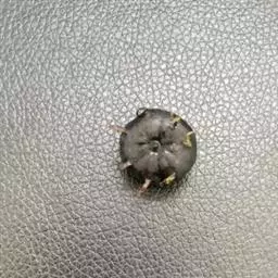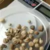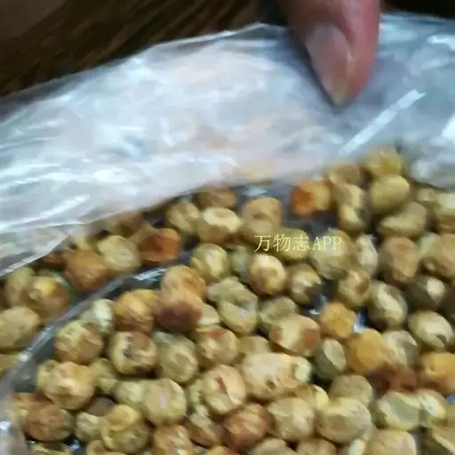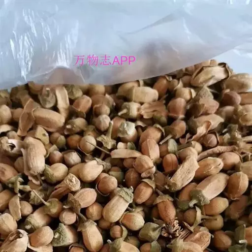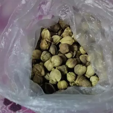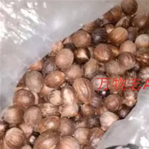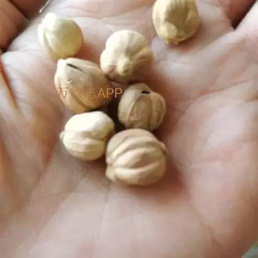 蒴果近球形,直径约16毫米,白色或淡黄色,略具钝三棱,有7-9条浅槽及若干略隆起的纵线条,顶端及基部有黄色粗毛,果皮木质,易开裂为三瓣;种子为不规则的多面体,直径约3-4毫米,暗棕色,种沟浅,有芳香味。花期:5月;果期:6-8月。