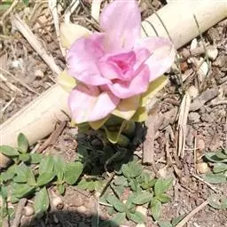 穗状花序自近茎基处的根茎上发出,圆柱形,稀为圆锥形,长8-11厘米,宽4-5厘米,密被覆瓦状排列的苞片;苞片三角形,长3.5-4厘米,麦秆黄色,具明显的方格状网纹;小苞片管状,一侧开裂;花萼管状,白色微透红,外被长柔毛,顶端具三齿,花冠管与花萼管近等长,裂片白色,长椭圆形,长约1厘米,宽约5毫米;唇瓣椭圆形,长约1.5厘米,宽约1.2厘米,中央黄色,内凹,边黄褐色,基部具瓣柄;雄蕊下弯,药隔附属体三裂,长约3毫米;子房被长柔毛。