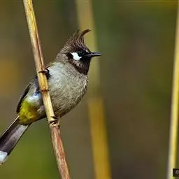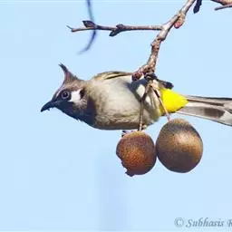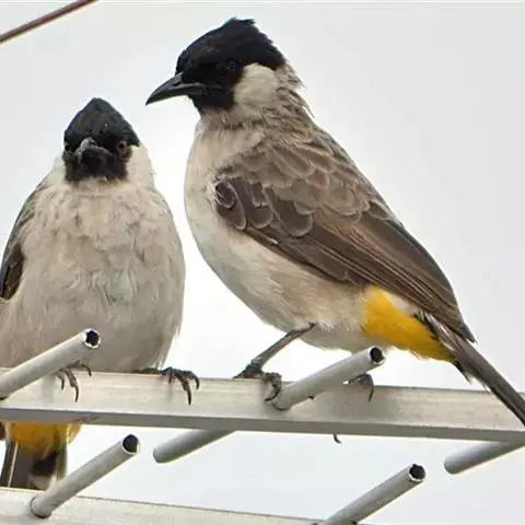 黄臀鹎(学名:Pycnonotus xanthorrhous):外形大小与红耳鹎相似,体长17-21厘米。额至头顶黑色,无羽冠或微具短而不明的羽冠。下嘴基部两侧各有一小红斑,耳羽灰褐或棕褐色,上体土褐色或褐色。颏、喉白色,其余下体近白色,胸具灰褐色横带,尾下覆羽鲜黄色。