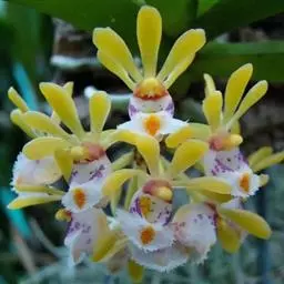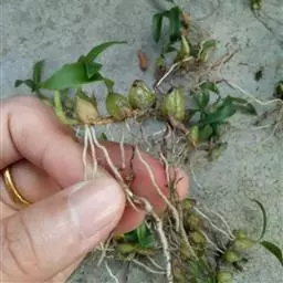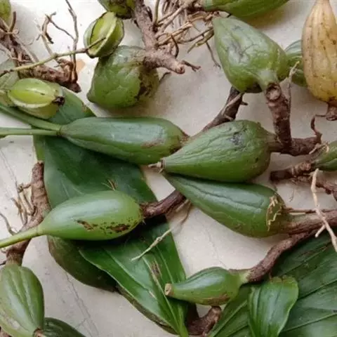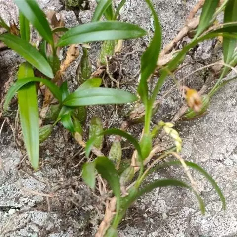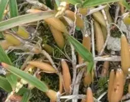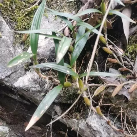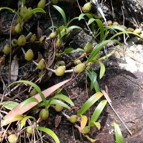 云南石仙桃:根状茎匍匐、分枝,粗4-6毫米,密被箨状鞘,通常相距1-3厘米生假鳞茎;假鳞茎近圆柱状…