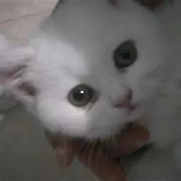 纯白色:闪闪发亮的纯白色。鼻头和足垫:粉红色;眼睛颜色:深蓝色或者红铜色.;金银眼则一眼为蓝色,一眼为红铜色,有同样深的色度。