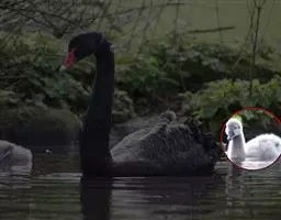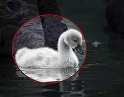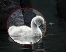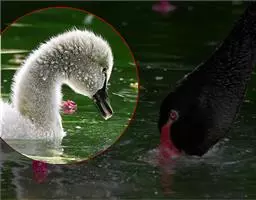 黑嘴天鹅是大型游禽,雄鸟身长145至163厘米,体重1180克;雌鸟139至150厘米,体重1000克。平均翼展为2.03米,平均体重为7~13.6公斤,平均寿命32岁 。雌雄同色,雌鸟体形略小于雄鸟,全身洁白,虹膜暗褐色,嘴黑色,沿嘴基有粉红色喙线。跗蹠、蹼、爪亦为黑色。幼鸟全身灰褐色,头和颈部较暗,下体、尾和飞羽较淡,嘴黄色。 [2-3]