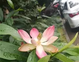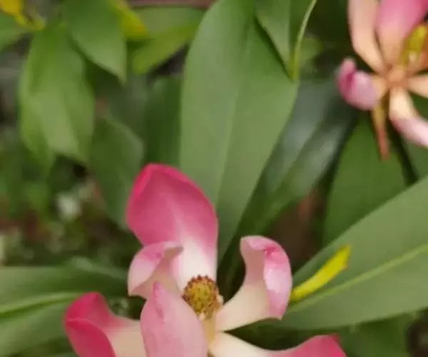 花芳香,花梗粗壮,直径8-10毫米,离花被片下约1厘米处具1苞片脱落环痕,花被片9-12,外轮3片褐色,腹面染红色或紫红色,倒卵状长圆形长约7厘米,向外反曲,中内轮6-9片,直立,乳白色染粉红色,倒卵状匙形,长5-7厘米,1/4以下渐狭成爪;雄蕊长10-18毫米,两药室稍分离,药隔伸出成三角尖,花丝与药隔伸出部分近等长;雌蕊群圆柱形,长5-6厘米,心皮无声,露出背面具浅沟。