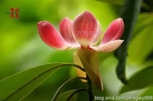 红色木莲(学名:Manglietia insignis(Wall.) Blume):是常绿乔木,高达30米,胸径40厘米;小枝无毛或幼嫩时在节上被锈色或黄褐毛柔毛。叶革质,倒披针形,长圆形或长圆状椭圆形。花芳香,花梗粗壮,直径8-10毫米,离花被片下约1厘米处具1苞片脱落环痕,花被片9-12,外轮3片褐色,腹面染红色或紫红色,倒卵状长圆形,中内轮6-9片,直立,乳白色染粉红色,倒卵状匙形,1/4以下渐狭成爪。聚合果鲜时紫红色,蓇葖背缝全裂,具乳头状突起。花期5-6月,果期8-9月。