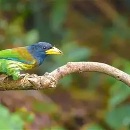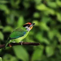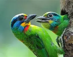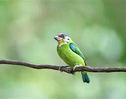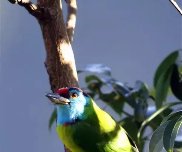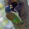 因为拥有良好的保护色,若不鸣叫很难发现它们的身影。以果实、浆果为主食,繁殖期育雏时则常以昆虫喂食幼鸟。常发出单调浑厚的“咯、咯、咯…”叫声,像极了和尚敲打木鱼的声音,加上头部参杂红、黄、蓝、绿、黑五色,所以又称为“森林里的花和尚”。繁殖期会在树干以其强而有力的嘴喙啄洞,巢筑于其内。