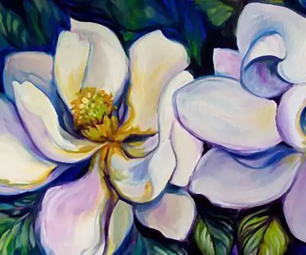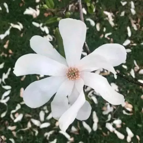 花白色,有芳香,直径15-20厘米;花被片9-12,厚肉质,倒卵形,长6-10厘米,宽5-7厘米;雄蕊长约2厘米,花丝扁平,紫色,花药内向,药隔伸出成短尖;雌蕊群椭圆体形,密被长绒毛;心皮卵形,长1-1.5厘米,花柱呈卷曲状。