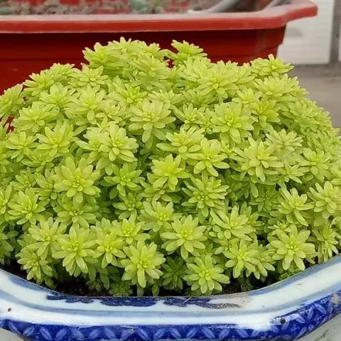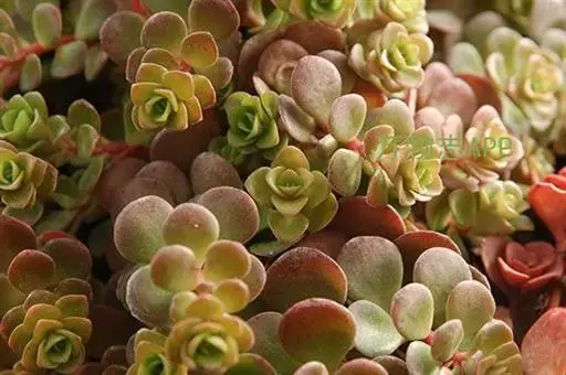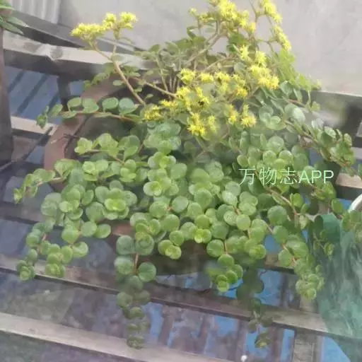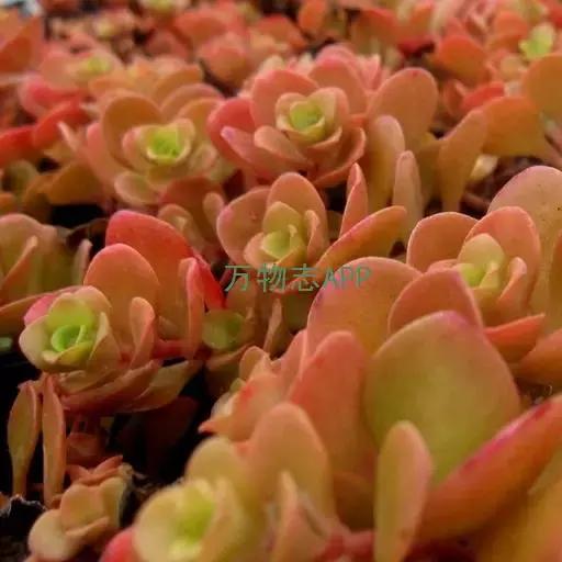 圆叶景天(Sedum sieboldii),景天科常绿多年生肉质草本植物,匍匐型生长,叶片对生,尖端钝圆,全光照条件下,叶片秋季变红,花瓣黄色或白色,花期4至6月。喜向阳和偏干环境,只要栽培在向阳、偏干的地方,就能茂盛生长;抗寒性强,病虫害较少。