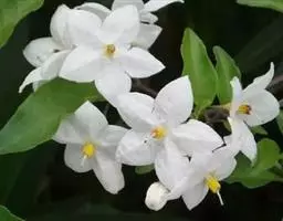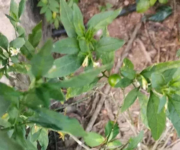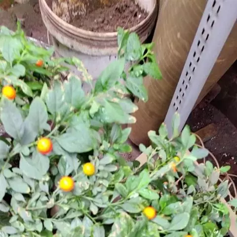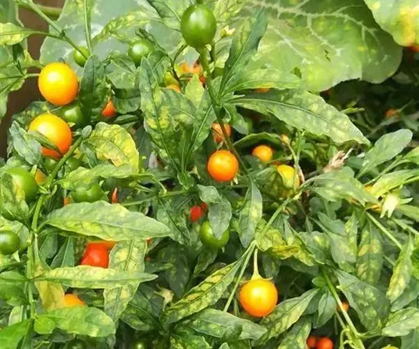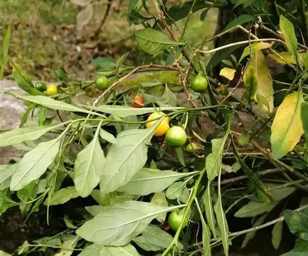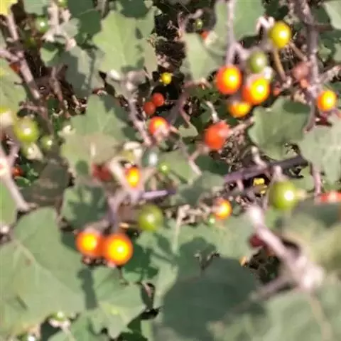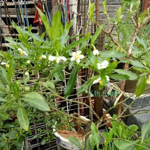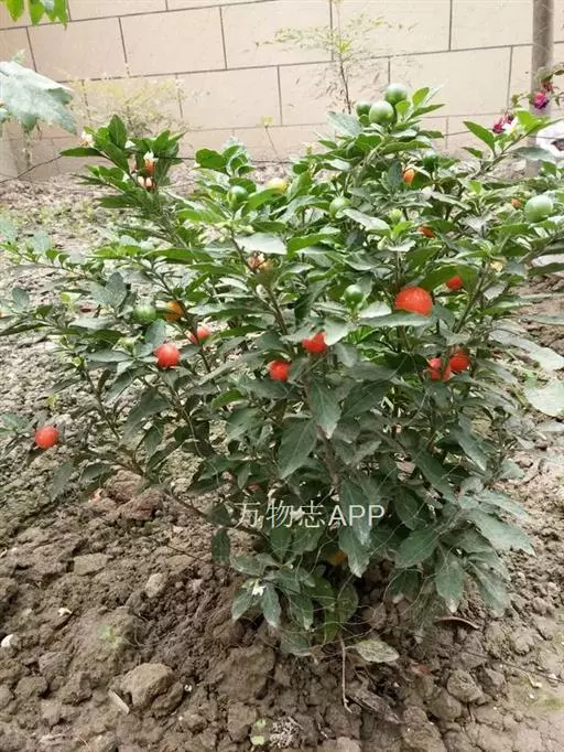 珊瑚豆(Solanum pseudocapsicum L. var. diflorum (Vell.) Bitter):直立分枝小灌木,高0.3-1.5米,小枝幼时被树枝状簇绒毛,后渐脱落。叶双生,大小不相等,椭圆状披针形,长2-5厘米或稍长,宽1-1.5厘米或稍宽,先端钝或短尖,基部楔形下延成短柄,叶面无毛,叶下面沿脉常有树枝状簇绒毛,边全缘或略作波状,中脉在下面凸出,侧脉每边4-7条,在下面明显;叶柄长约2-5毫米,幼时被树枝状簇绒毛,后逐渐脱落。花序短,腋生,通常1-3朵,单生或成蝎尾状花序,总花梗短几近于无,花梗长约5毫米,花小,直径约8-10毫米;萼绿色,5深裂,裂片卵状披针形,端钝,长约5毫米,花冠白色,筒部隐于萼内,长约1.5毫米,冠檐长约6.5-8.5毫米,5深裂,裂片卵圆形,长约4-6毫米,宽约4毫米,端尖或钝;花丝长约1毫米,花药长圆形,长约为花丝长度的2倍,顶孔略向内;子房近圆形,直径约1.5毫米,花柱长约4-6毫米,柱头截形。浆果单生,球状,珊瑚红色或桔黄色,直径1-2厘米;种子扁平,直径约3毫米。花期4-7月,果熟期8-12月。原产于巴西;在中国栽培,有时归化为野生种,见于河北、陕西、四川、云南、广西、广东、湖南、江西诸省。在四川、云南、广东、广西尤多见于田边、路旁、丛林中或水沟边,海拔1350-2800米地区常见,600米地区也有分布。果色鲜艳,可供观赏。