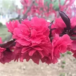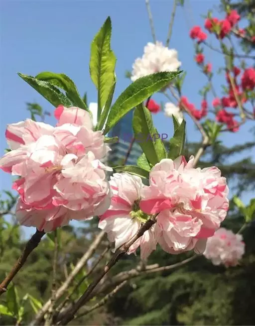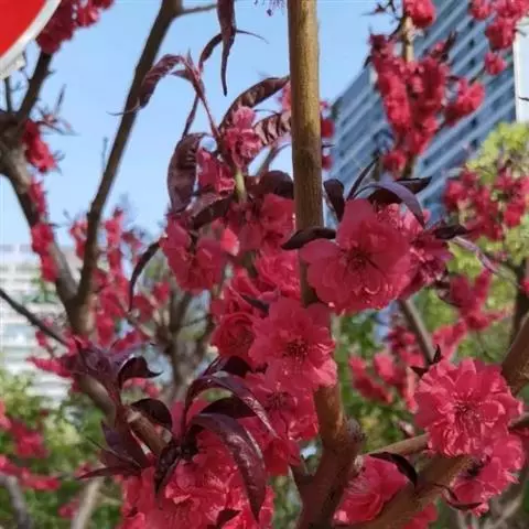 属于观赏桃花类的半重瓣及重瓣品种,统称为碧桃。华东地区碧桃花期是3月~4月,花朵丰腴,色彩鲜艳丰富,花型多。常见的品种有红花绿叶碧桃、红花红叶碧桃,白红双色洒金碧桃等多个变种。碧桃具有很高的观赏价值,在小区、公园、街道随处可见的美丽植物。
