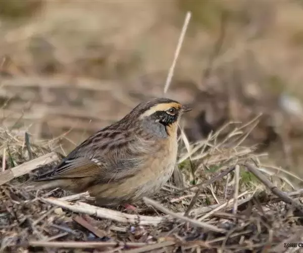 额、头顶、枕、头侧黑色,眉纹皮黄色或棕黄色、长且宽阔,从额基侧一直延伸到头后侧。后颈、背、肩栗褐色,各羽均具有黑褐色羽干纹或羽干纹不明显。有的背、肩呈淡褐或棕褐色具栗色羽干纹。腰和尾上覆羽灰褐或橄榄褐色,尾灰褐或黑褐色,翅上覆羽褐色或黑褐色。中覆羽和大覆羽尖端黄白色或棕色,在翅上形成两道明显的翅斑。飞羽褐色或黑褐色,外翈羽缘淡红褐色。颏、喉、上胸棕色或黄褐色,胸部羽基黑褐色微呈鳞状斑,胸侧和两胁黄褐色或棕色、具栗褐色纤细纵纹,腹中部和尾下覆羽皮黄色或皮白色沾棕。