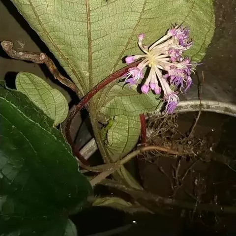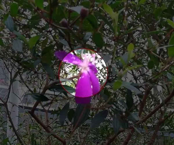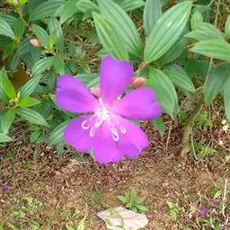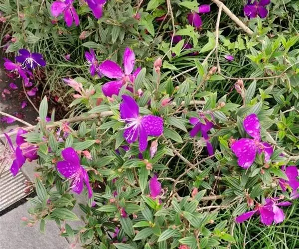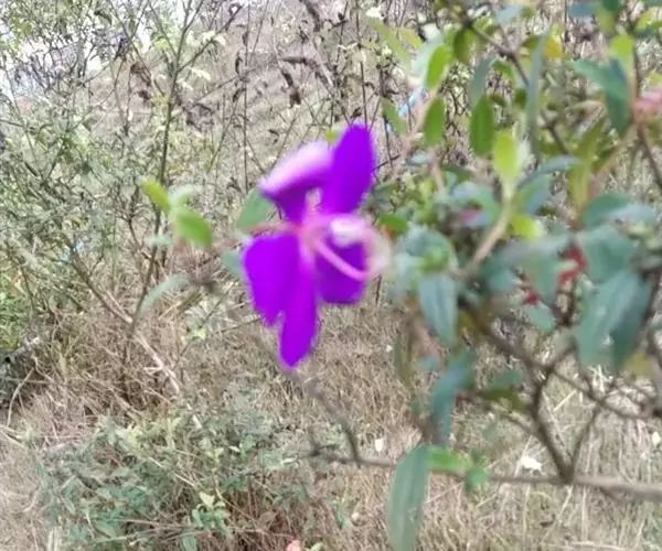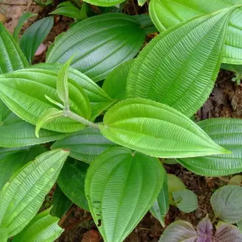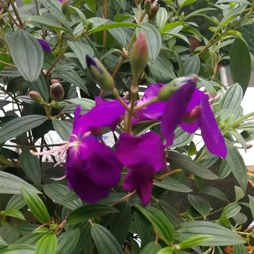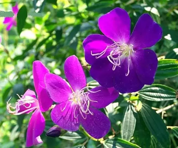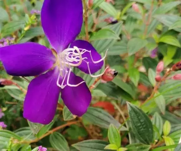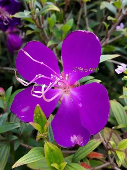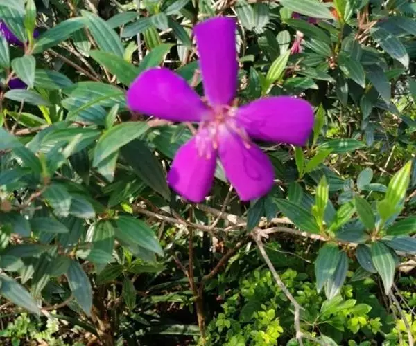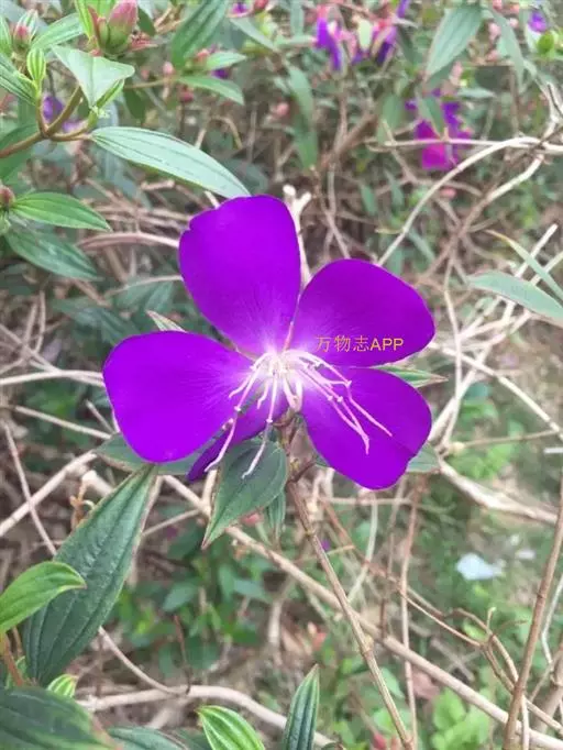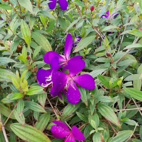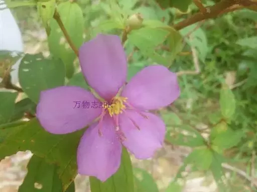 巴西野牡丹,常绿灌木,高0.6-1.5 米。茎四菱形,分枝多,枝条红褐色,株形紧凑美观;茎、枝几乎无毛。叶革质,披针状卵形,顶端渐尖,基部楔形,长3-7厘米,宽1.5-3厘米,全缘,叶表面光滑,无毛,5 基出脉,背面被细柔毛,基出脉隆起。