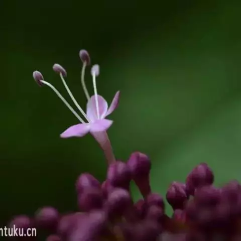 伞形花序着生于分枝顶端,近头状,有花3-5朵;花瓣5枚;花萼长约8毫米,密被较短的糙伏毛,顶端圆钝,背面被毛;花瓣紫色,雄蕊白色且上曲;雄蕊明显比雄蕊伸长膨大。