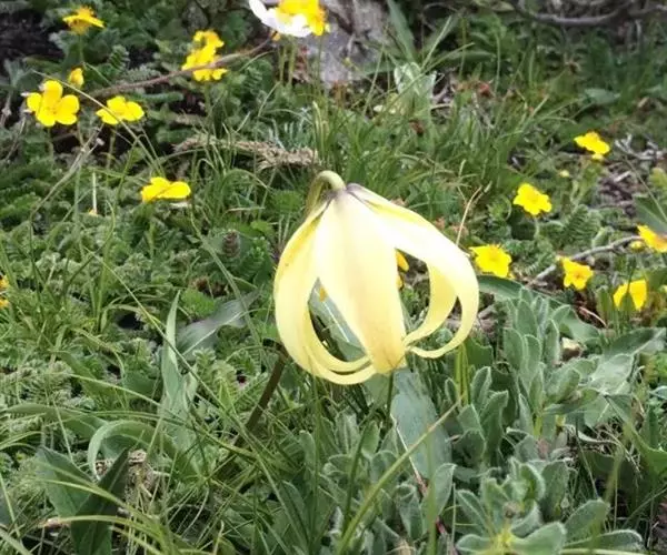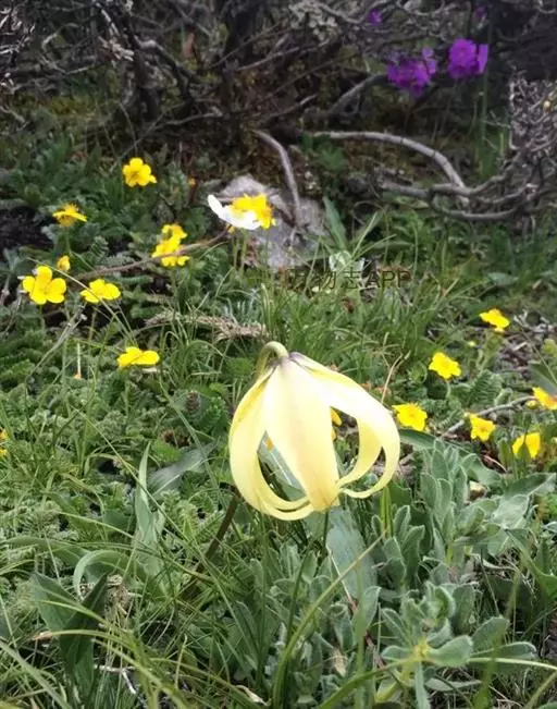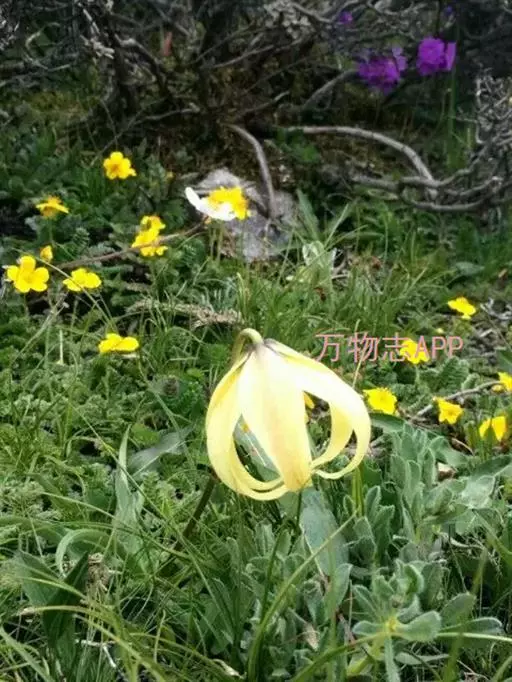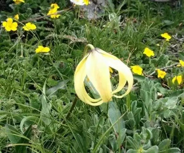 尖被百合(学名:Lilium lophophorum (Bur. et Franch.) Franch.):鳞茎近卵形,高4-4.5厘米,直径1.5-3.5厘米;鳞片较松散,披针形,白色,鳞茎上方的茎上无根。叶变化很大,由聚生至散生,披针形、矩圆状披针形或长披针形,3-5条脉。花通常1朵,少有2-3朵,下垂;花黄色,淡黄色或淡黄绿色,具极稀疏的紫红色斑点或无斑点;花被片披针形或狭卵状披针形,长4.5-5.7厘米,宽0.9-1.6厘米,先端长渐尖,内轮花被片蜜腺两边具流苏状突起。蒴果矩圆形,成熟时带紫色。花期6-7月,果期8-9月。