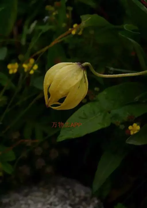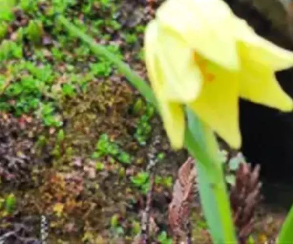 花通常1朵,少有2-3朵,下垂;花梗长9-15厘米;苞片叶状,披针形,长5-13厘米,宽3-10毫米;花黄色,淡黄色或淡黄绿色,具极稀疏的紫红色斑点或无斑点;花被片披针形或狭卵状披针形,长4.5-5.7厘米,宽0.9-1.6厘米,先端长渐尖,内轮花被片蜜腺两边具流苏状突起;雄蕊向中心靠拢,长1.5-2厘米;花丝钻状,无毛,花药椭圆形,长0.7-1厘米;子房圆柱形,长1-1.2厘米,宽3-4毫米;花柱长约1厘米,柱头膨大,头状。