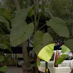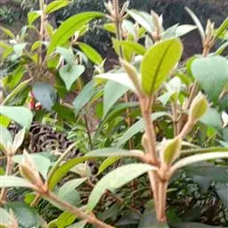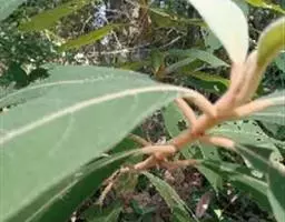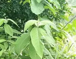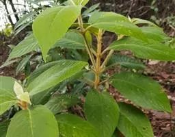 叶片宽卵形、卵形或椭圆形,长7-15厘米,宽4-9厘米,顶端尖或渐尖,通常钝头,基部宽楔形至浑圆,全缘,表面深绿色,幼时有黄褐色星状毛,老后脱落几无毛,背面密生灰黄色厚茸毛,侧脉7-9对;叶柄长约2厘米。