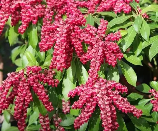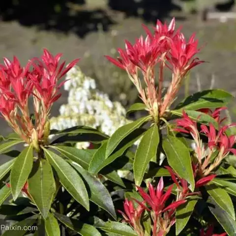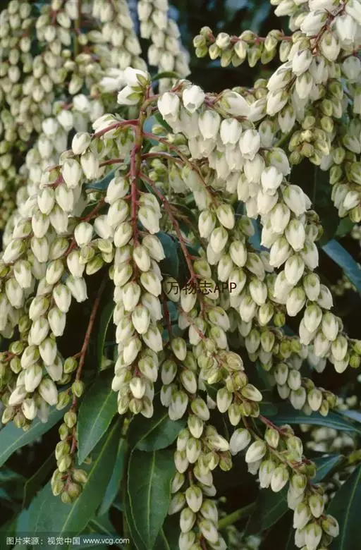 马醉木2-4月开花,总状花序,花序上有白色壶状小花数朵,排列别致有趣。马醉木树姿优美,因叶色随着叶的新老程度不同而变化,所以同一时期会同时拥有红、粉红、嫩黄、绿色等叶片,异彩纷呈,有着较高的观赏价值和园林应用价值。马醉木可应用于花篱和色块配置、块状种植和边缘灌木,色彩艳丽,萌发力强,它是园林绿化向高品位方向发展更新树种的理想选择之一,一年四季均可观赏,也可作为盆栽推广,是一种布置庭园的好材料。