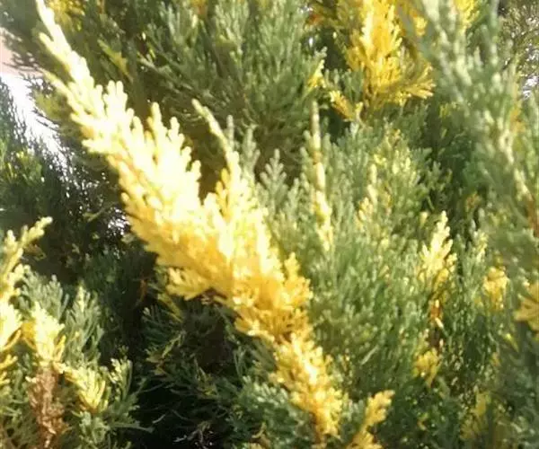 洒金柏短生密丛,树冠圆球至圆卵形,叶淡黄绿色,入冬略转褐色。