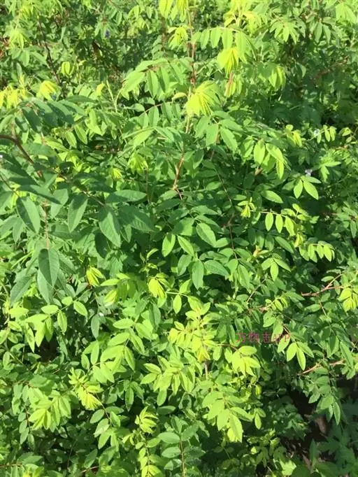 落叶灌木,丛生,高1-4米。小枝灰褐色,被疏毛,后变无毛,嫩枝密被短柔毛。叶互生,奇数羽状复叶,长10-15厘米,有小叶11-25片,基部有线形托叶;叶柄长1-2厘米;小叶卵形或椭圆形,长1-4厘米,宽0.6-2.0厘米,先端圆形,锐尖或微凹,有一短而弯曲的尖刺,基部宽楔形或圆形,上面无毛或被疏毛,下面有白色短柔毛,具黑色腺点。