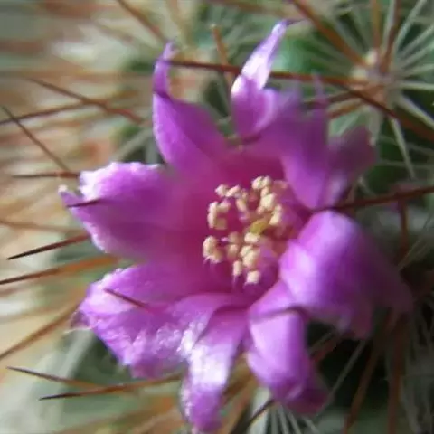 松霞是仙人掌科乳突球属的多年生肉质植物。单个球体小,呈圆筒状,暗绿色,疣状突起小,呈圆形,刺座无毛,…